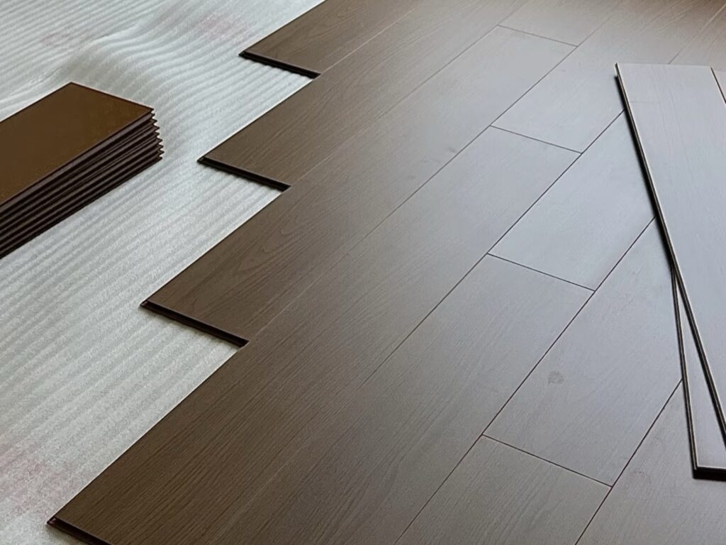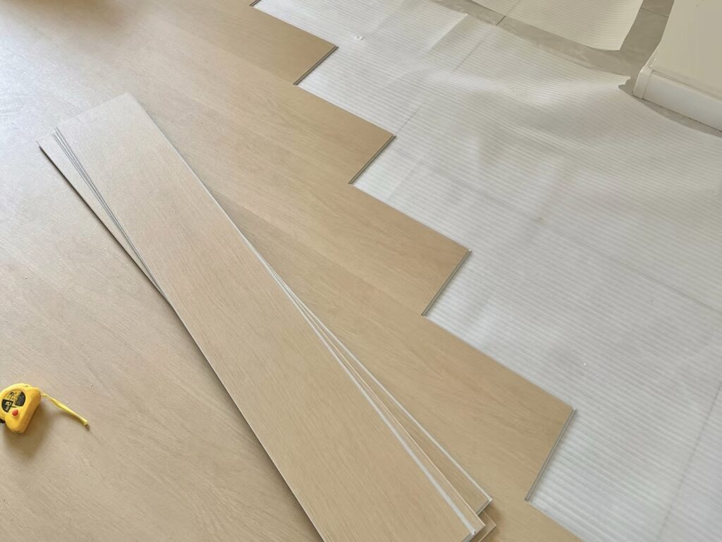 3. Lay the underlayment: Unroll the underlayment across the subfloor, starting from one corner of the room. Overlap the edges of the underlayment by about 2 – 3 inches and secure them together using adhesive tape. Make sure the underlayment is smooth and free of wrinkles.